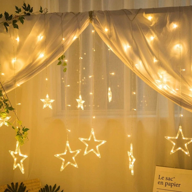 Instalatie Ghirlanda Luminoasa de Craciun 12 Stele cu LEDuri cu lumina alb cald , 3x1m, perdea cu franjuri inegali interconectabila