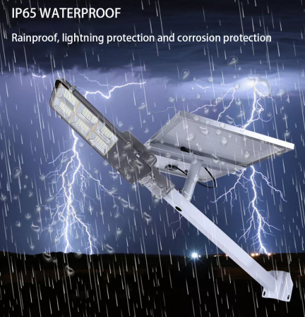 Pachetul include: Lampa solara cu baterie incorporata, panou fotovoltaic, telecomanda+suport metalic+manual instructiuni.